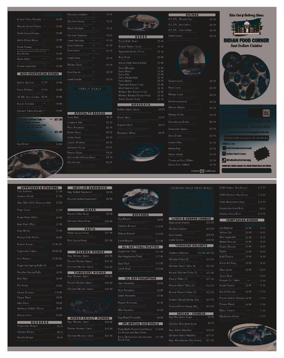Choice of butter chicken or curry chicken,Daal/ Veg.Sabzi, rice, two tawa rotis, salad and dessert.