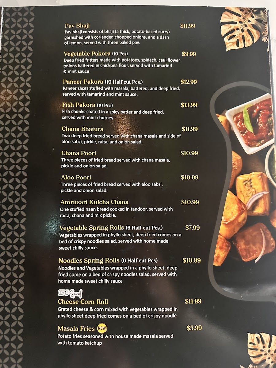 Deep fried fritters made with potatoes, spinach, onions battered in chickpea flour.